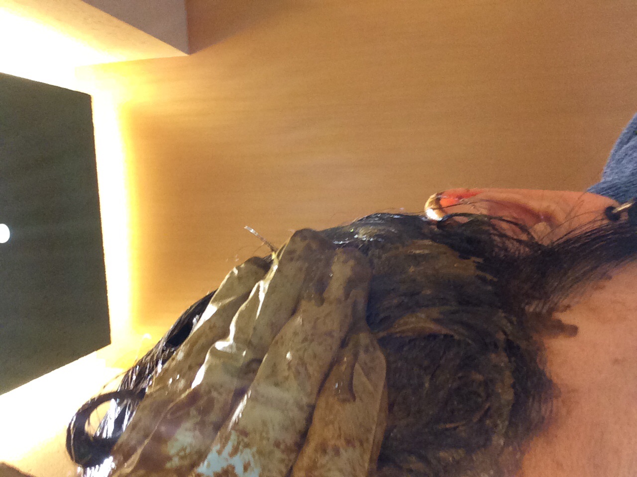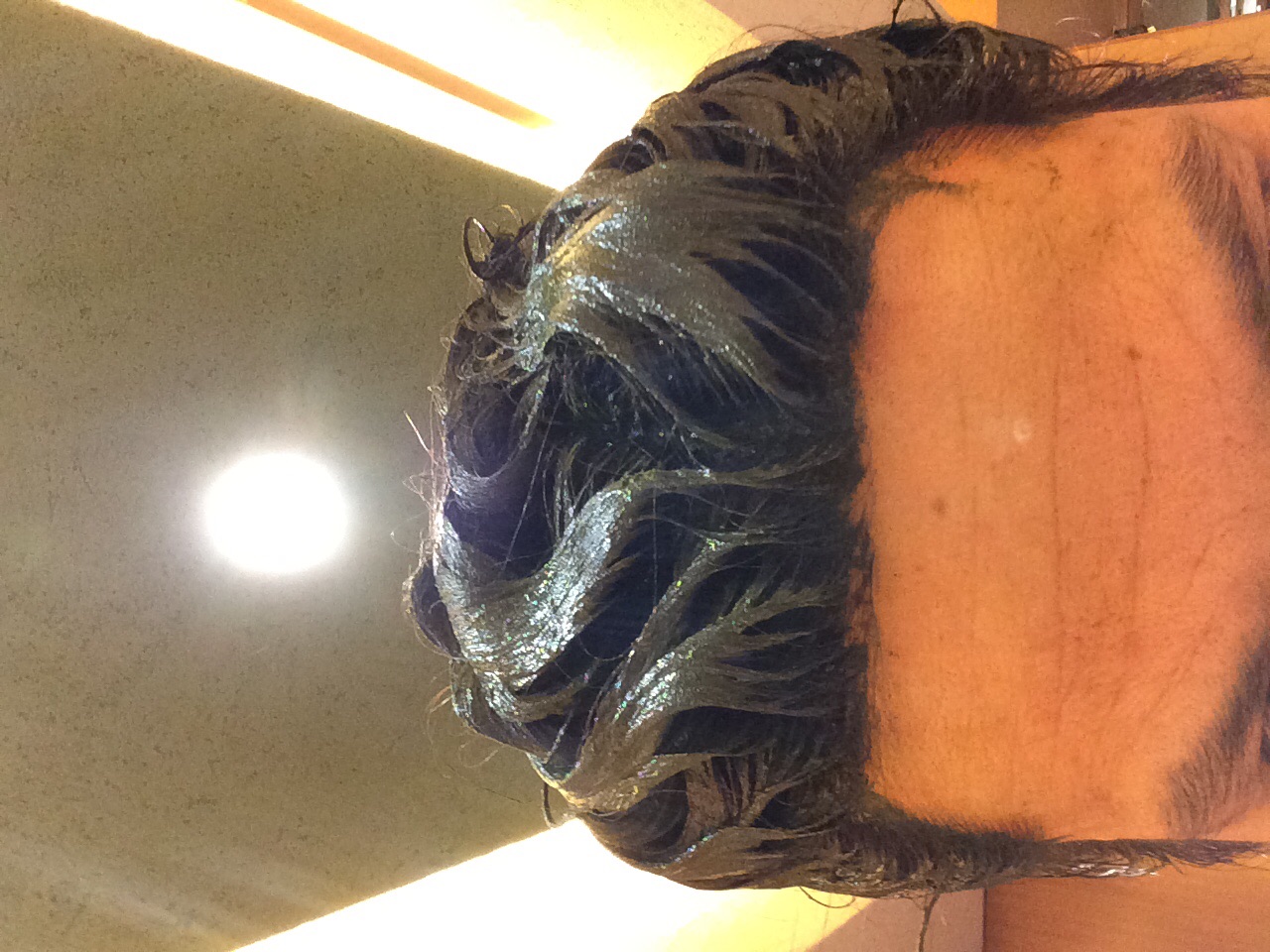 たっぷりとまんべんなく乗せて行きます。今回僕は1年半ぶりなので毛先まで染めて行きます。